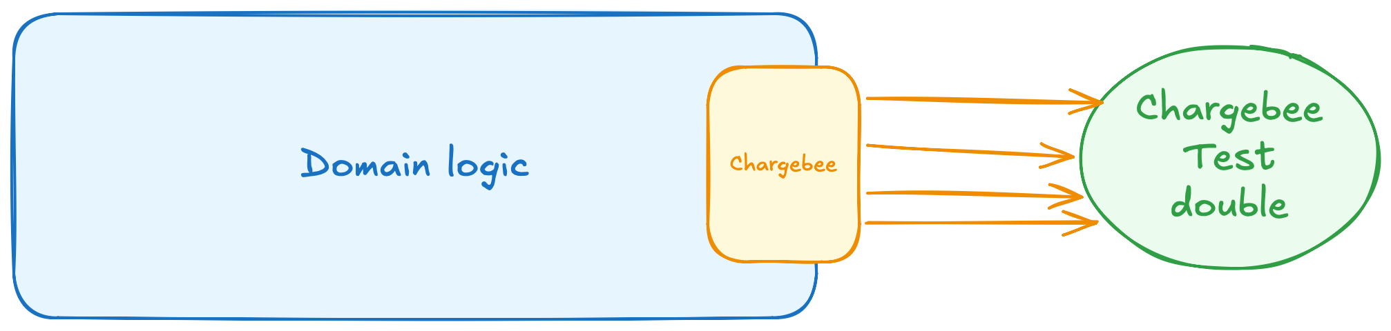 All the calls are grouped in one place. I specifically placed it on the edge of the domain area, because it’s a port — a window our application can explicitly use to communicate with the outside world. And through that window, we can pass in different adapters. It will be a Chargebee API client for production, but an in-memory test double for our high-level test: