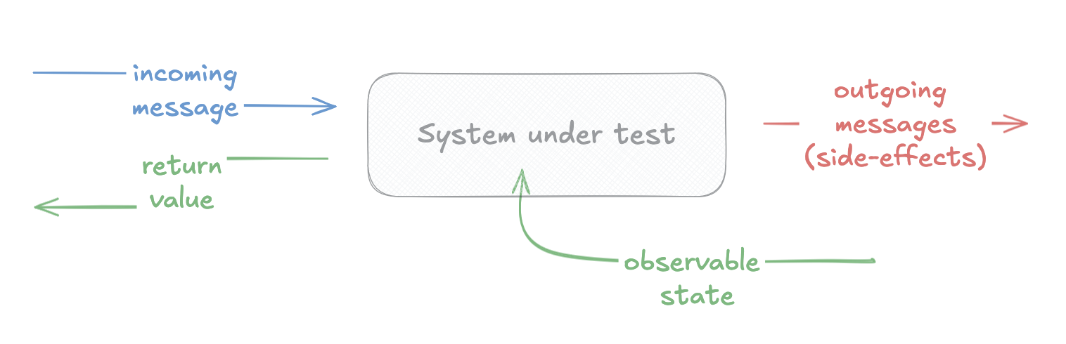 The public-facing interface of the app is an HTTP endpoint taking a request and returning a response. After changing state, for example, by creating a record, we may query the list endpoint for the same record type to verify the expected side effects (in other words, we check if the record was created). On top of that, there might be other side effects which are not as directly observed — when the app needs to communicate with a 3rd party, calling an API, sending an email, putting a message on a broker, or others.